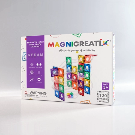 - Odkryj kulodrom MAGNICREATIX DYNAMIC 120 el. – edukacyjny tor kulkowy w żywych kolorach. Magnetyczny system, świecące kulki, zabawa i nauka STEAM w jednym!